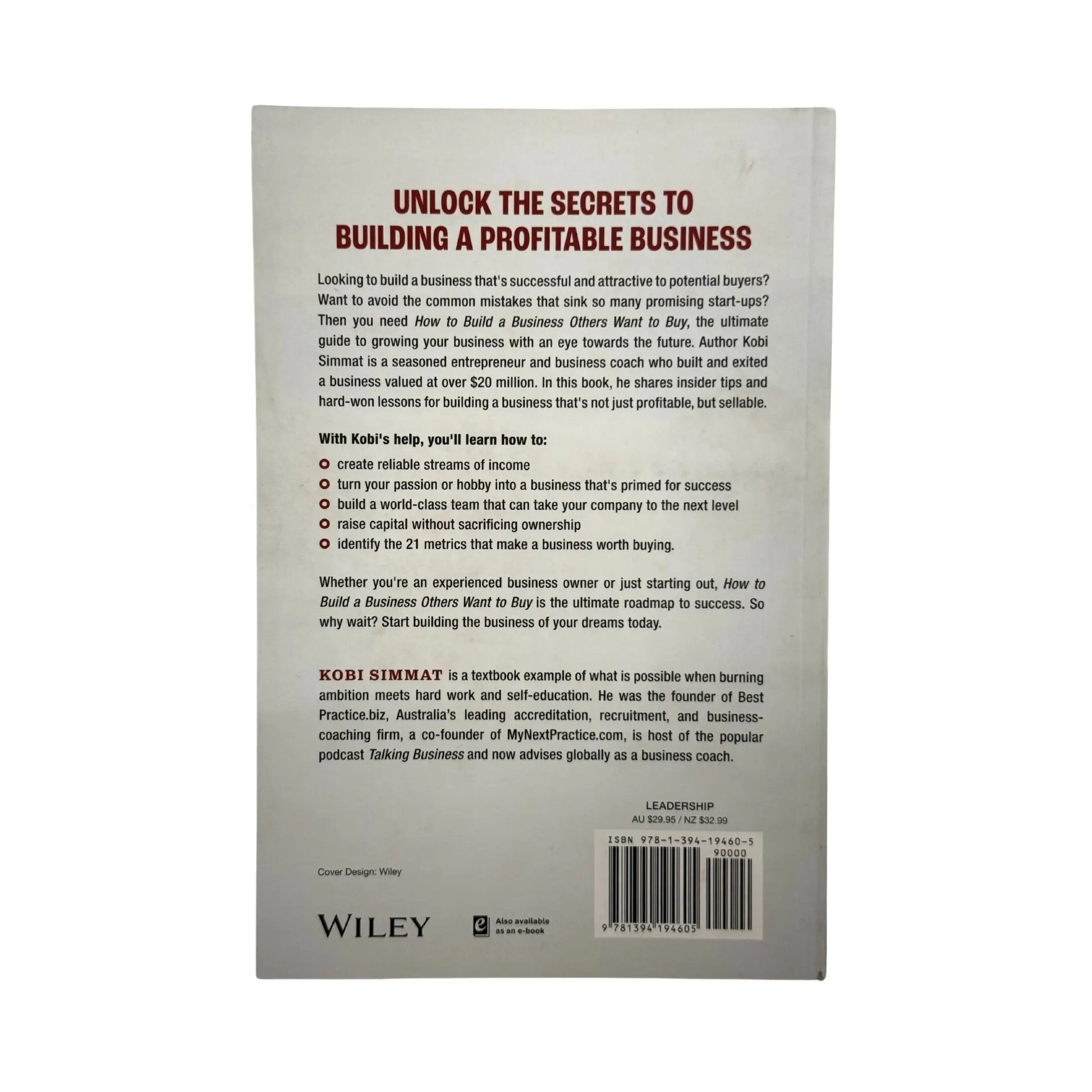 A 5-step blueprint for business brilliance In How to Build a Business Others Want to Buy, successful entrepreneur Kobi Simmat reveals how to build a profitable, attractive business and sell it for the payday of your dreams. As a business coach and accreditation expert, Kobi built a multi-million-dollar business around knowing exactly what sets a successful business apart from its competitors. In this book, he shares the secrets he learned on that journey. You’ll discover a 5-step process that starts with an idea and ends with a respected, sustainable brand that generates enviable profits. How to Build a Business Others Want to Buy shares templates, tips, and actionable insights that show you how to create systems for success. You’ll learn how to identify game-changing trends, and you’ll understand the 5 Ms that make or break a business: Mindset, Momentum, Management, Marketing, and Money. Fund and own your business, without relying on external investors Identify the top-15 drivers and metrics that make a business valuable Develop a scalable sales pipeline and recurring streams of revenue Attract desirable partnerships and win multi-million-dollar contracts from government and tier-one operators Discover best-practice tools and techniques for recruitment, coaching, and building a loyal, self-sufficient team that delivers resultsUltimately, you’ll learn how to build a business that will survive economic uncertainty and become a highly sought-after target — so you can sell it for a significant profit. How to Build a Business Others Want to Buy is a must-read for small business owners and entrepreneurs who want to grow their business the right way, with a lucrative end goal in mind.