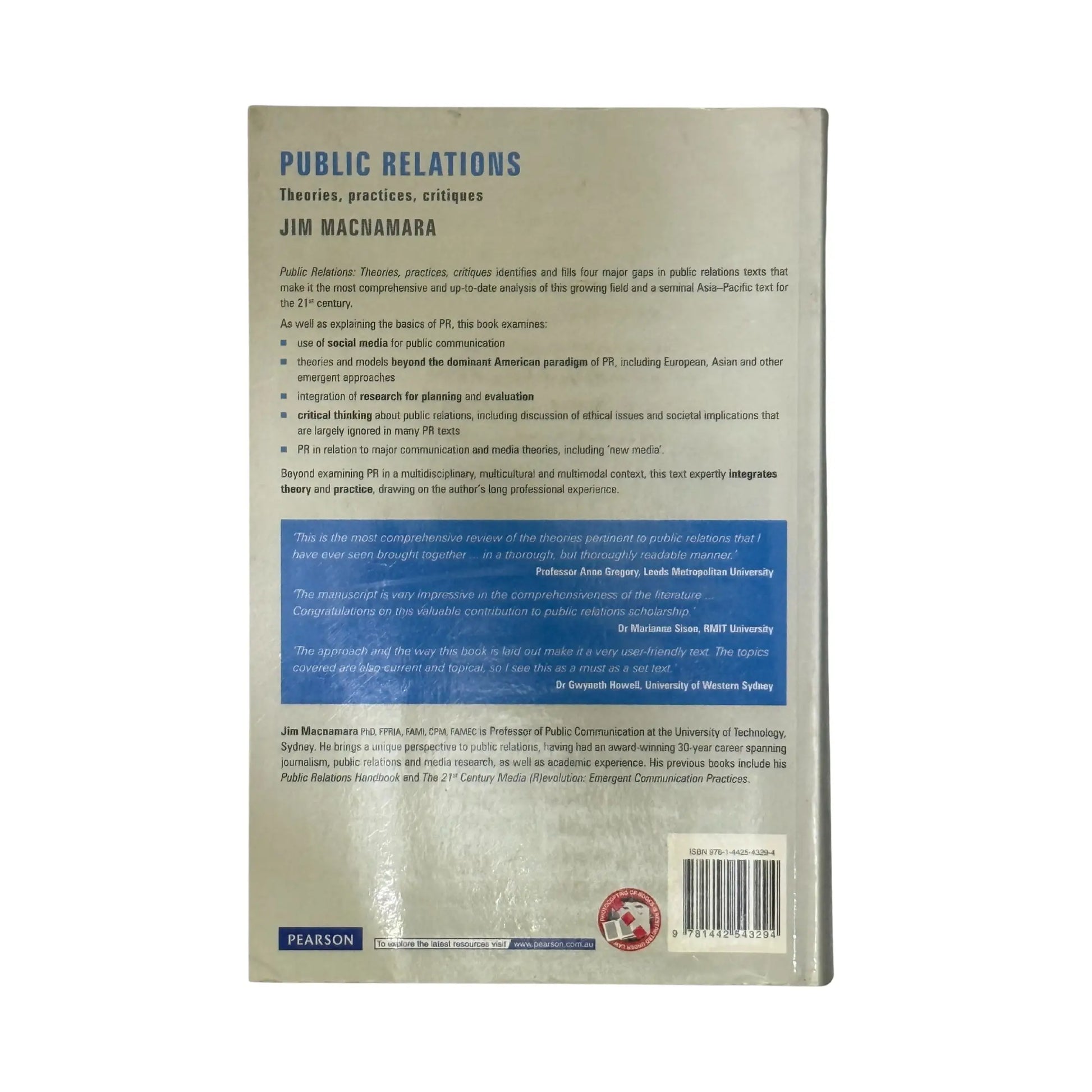 Public Relations: Theories, Practices, Critiques is an essential resource for Australian public relations students. Jim MacNamara, one of Australia's best-known and widely-respected public relations and communication professionals, clearly explains public relations concepts, models and theories and applies theory to Australian practice with case studies and culturally relevant examples. The latest industry practices, methods and activities, including the latest thinking about Web 2.0 and Web 3.0 media and communication practices are covered in detail. In addition, practical tools, resources and case studies are provided in the Appendices. In a clear, lively and engaging style, Jim challenges the US-centric models and theories of public relations and encourages students to think critically about communication and public relations.