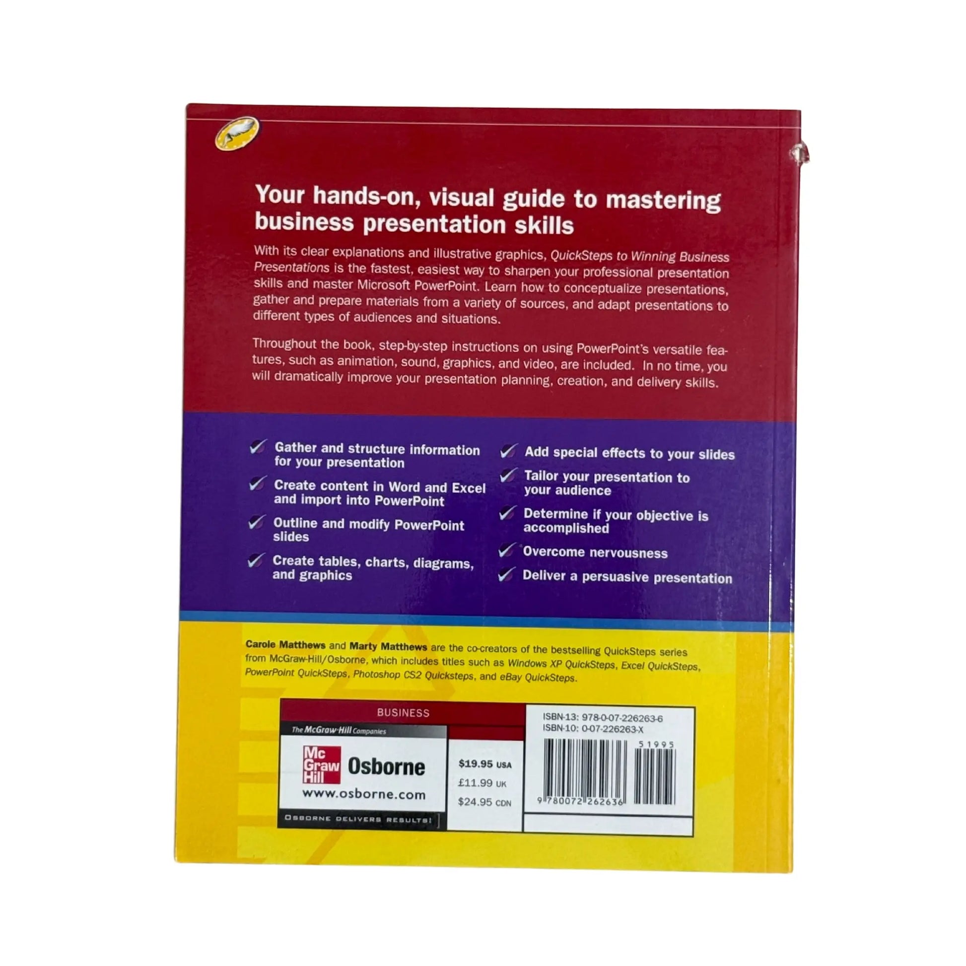 A hands-on, visual guide to mastering business presentation skillsWith its clear explanations and illustrative graphics, QuickSteps to Winning Business Presentations is the fastest, easiest way to achieve professional business presentation skills using Microsoft PowerPoint. Learn how to conceptualize presentations, gather and prepare materials from a variety of sources, and adapt presentations to different types of audiences and situations, including Web delivery. Step-by-step instructions on using PowerPoint’s versatile features, such as animation, sound, graphics, and video, are also included. In no time, you will dramatically improve your presentation skills.