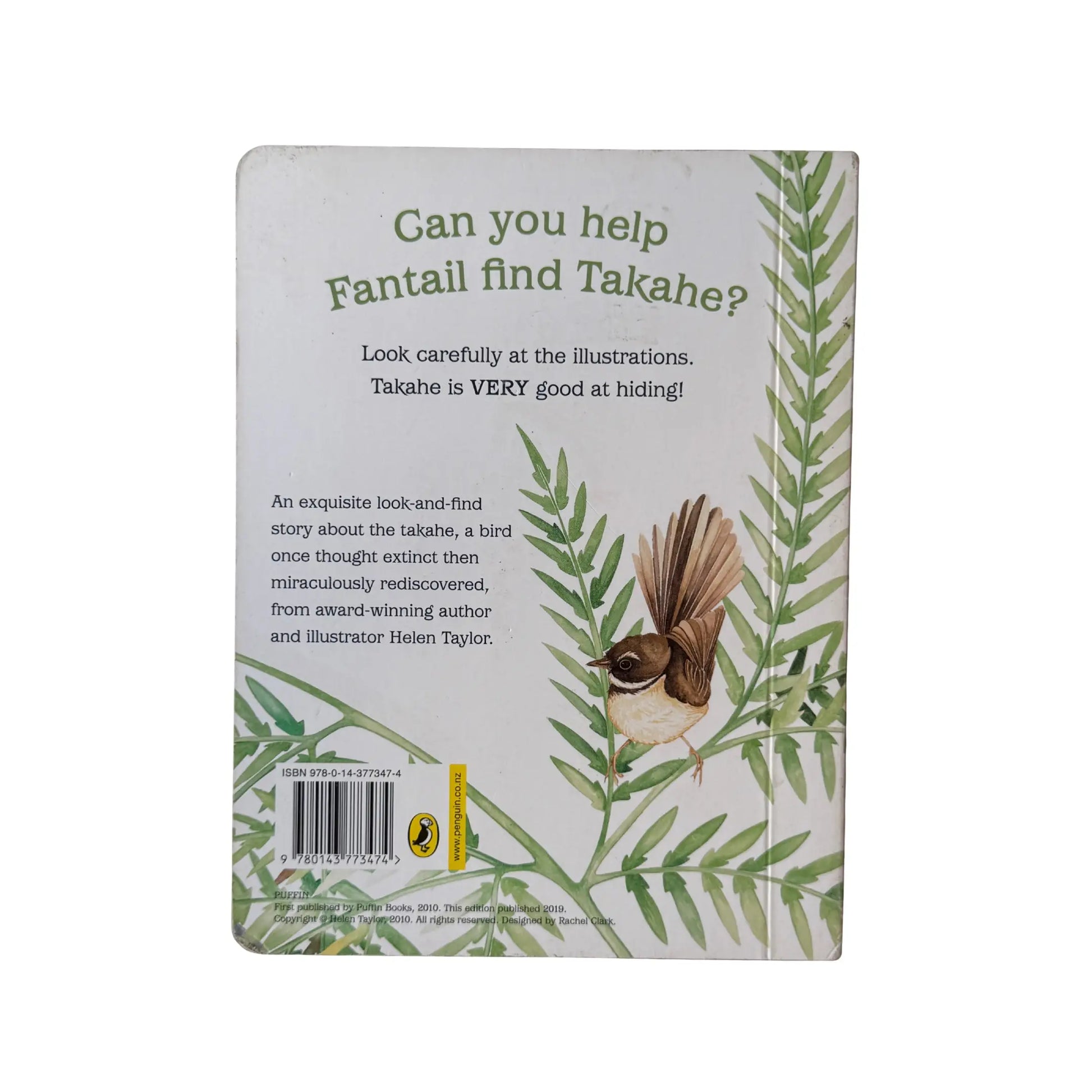 About the Author Helen Taylor is an award-winning children's book illustrator and an exhibiting artist. She has been twice shortlisted for the LIANZA Children's Book Awards. In 2006, Helen won Best Picture Book in the New Zealand Post Book Awards for Children and Young Adults, with A Booming in the Night. Product Description Fantail is looking for Takahe, but where can he be? Is he playing with Weka in the snow, or maybe dancing with Kakapo in the glow of the moon? Perhaps he is splashing through puddles with long-legged Pukeko? Look VERY carefully at all the illustrations—could Takahe have been here all along? An exquisite look-and-find story inspired by the true history of New Zealand's flightless and indigo-feathered takahe. Once thought to be extinct, it was rediscovered in 1948—the takahe showing just how good at hiding it is!